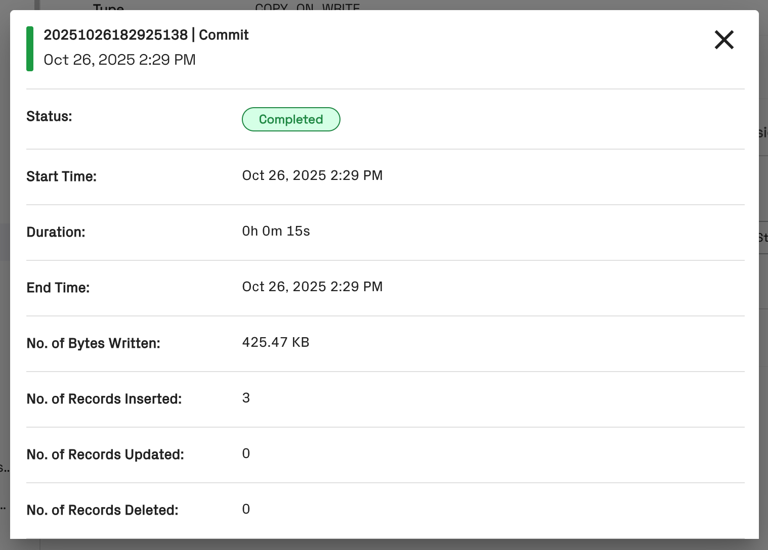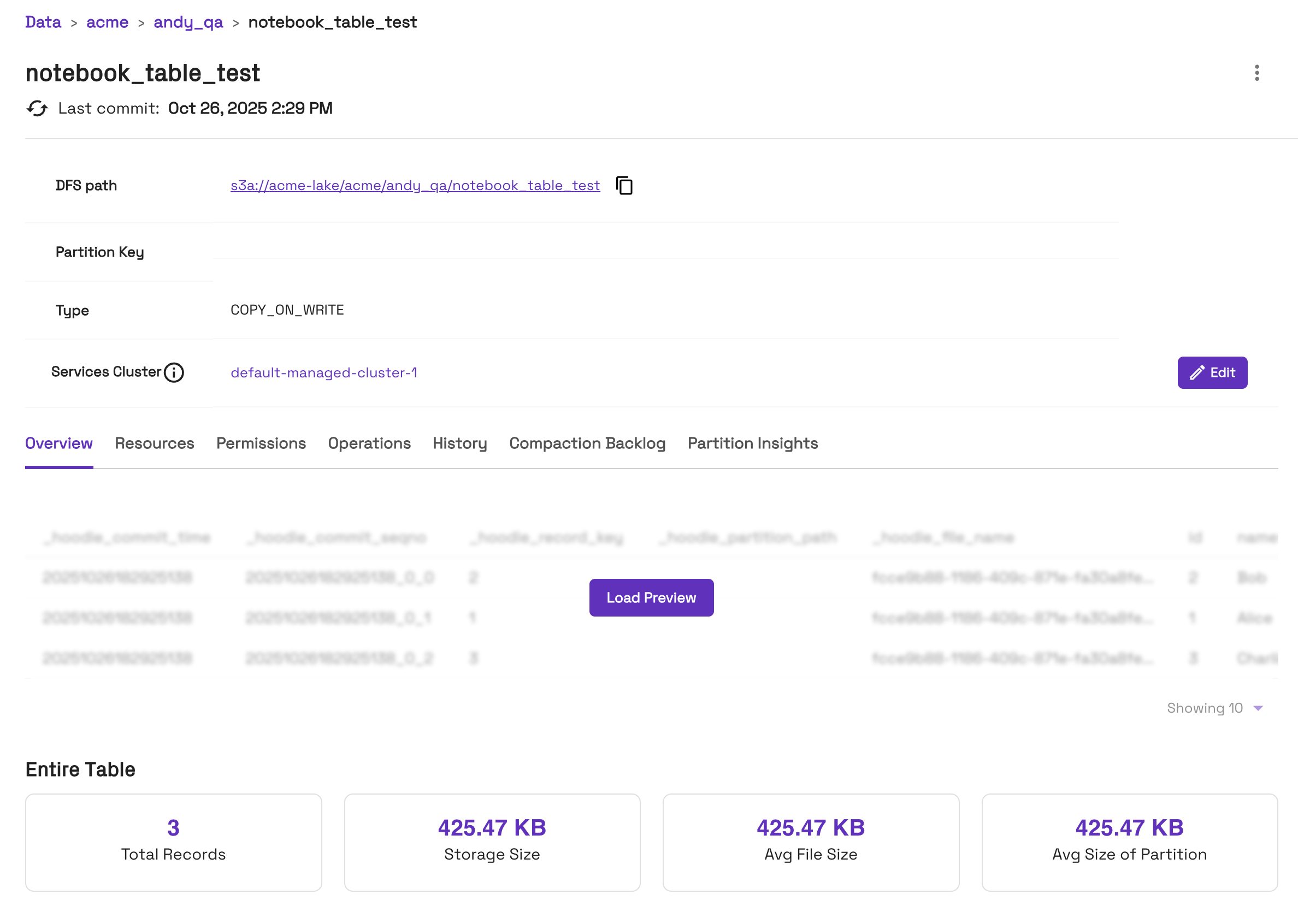 - On the History tab for the table, you can view commits:
