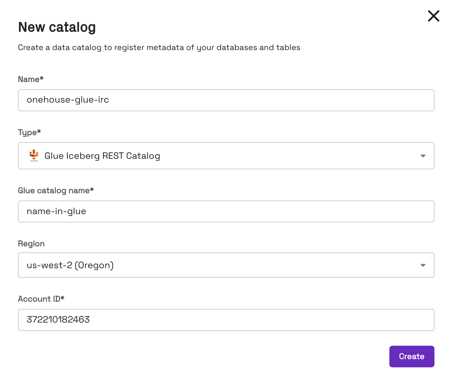 - Name: Unique identifier for the data catalog in Onehouse. This does not need to match the Glue catalog name in AWS.