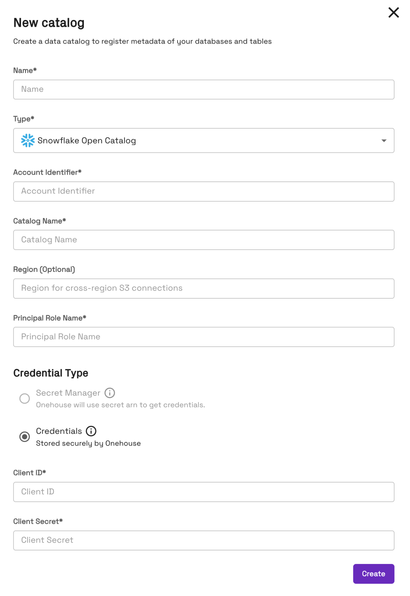 - Name: Unique identifier for the data catalog in Onehouse. This does not need to match the catalog name in Snowflake.