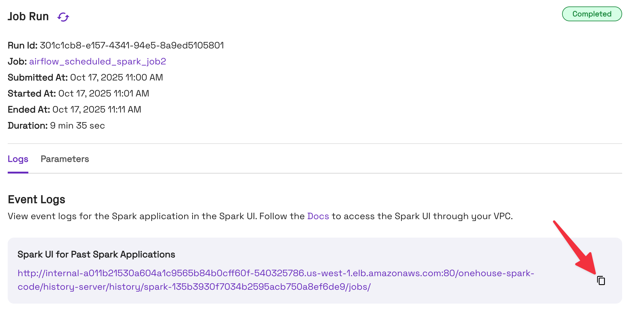 http://internal-a011b21530a604a1c9565b84b0cff60f-540325786.us-west-1.elb.amazonaws.com:80/onehouse-spark-code/history-server/history/spark-135b3930f7034b2595acb750a8ef6de9/jobs/ - Access via bastion host: Replace the host in the ILB URL with the