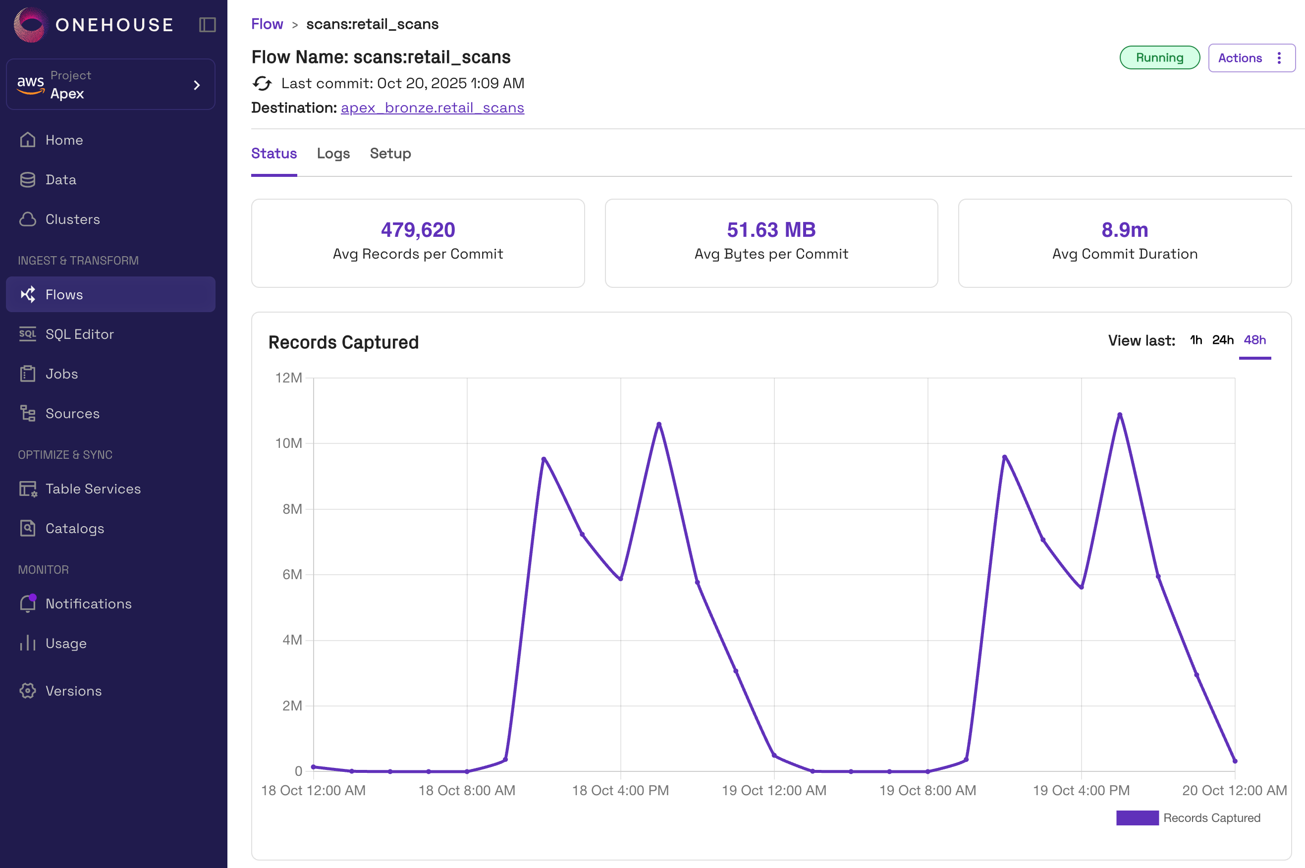 Flows create Onehouse tables in the Apache Hudi table format. To add read-compatibility in Apache Iceberg and Delta Lake, simply add a OneTable catalog in your Flow.