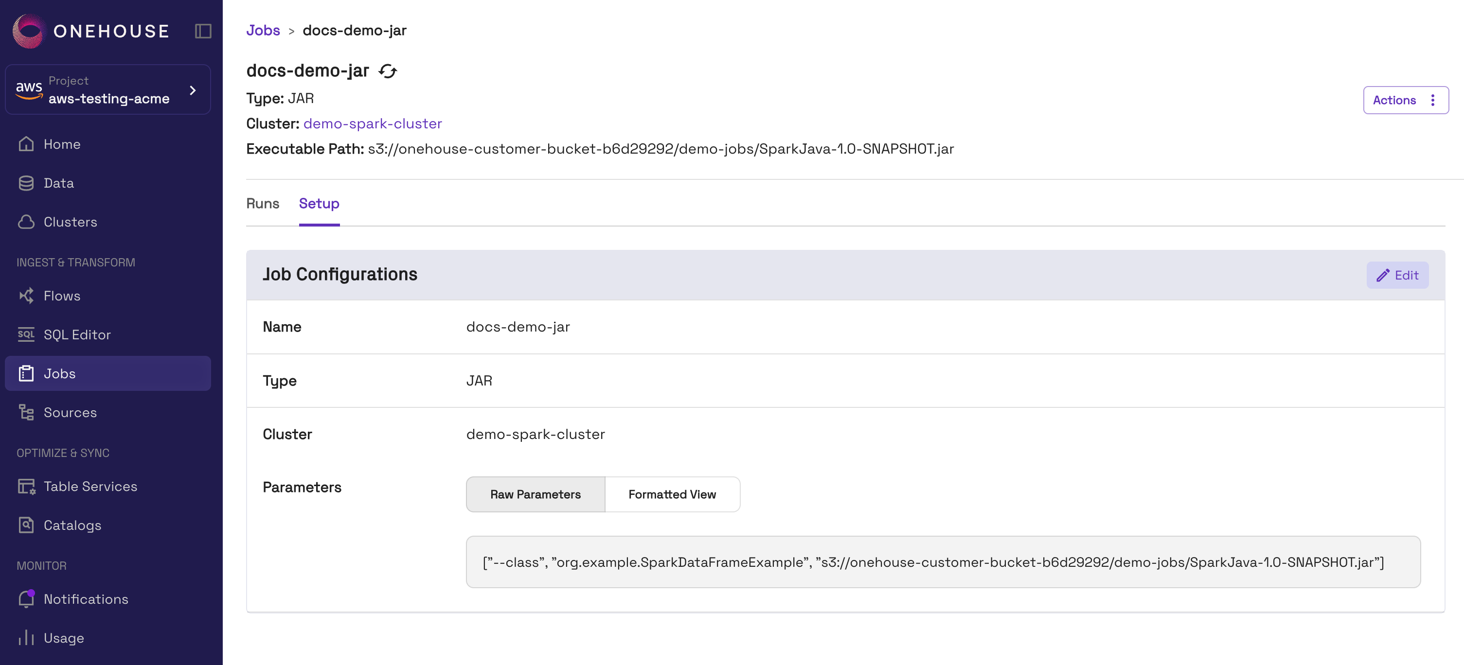 SparkJavaexample, replacing the JAR path with your own:["--class", "org.example.SparkDataFrameExample", "s3://onehouse-customer-bucket-12345/demo-jobs/SparkJava-1.0-SNAPSHOT.jar"]