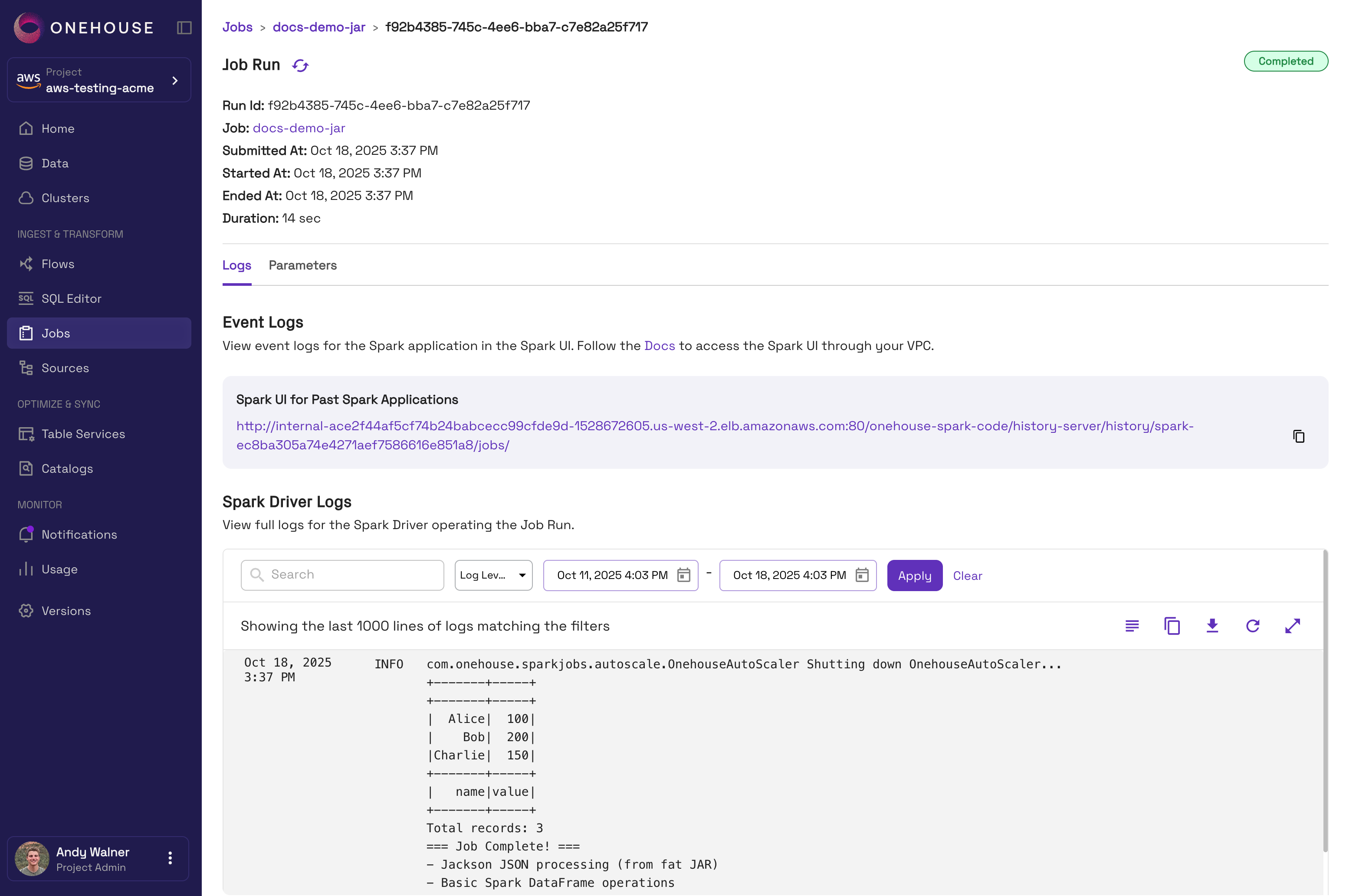 RUN JOBAPI command. - When the Job starts running, you can view the driver logs in the Onehouse console by clicking into the Job run. Read more here on monitoring Job runs.