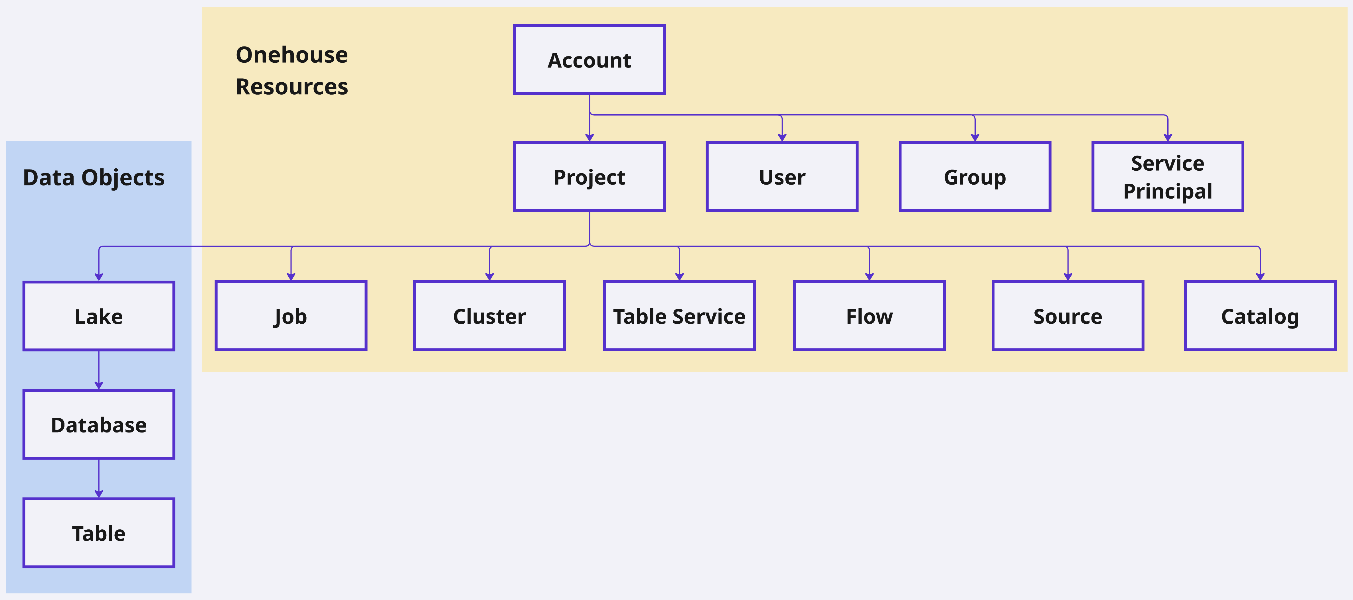 | Onehouse Resources | Logical Onehouse entities in your account or project. | Roles | Account, Projects, Users, Groups, Service Principals, Jobs, Clusters, Table Services, Flows, Sources, and Catalogs |